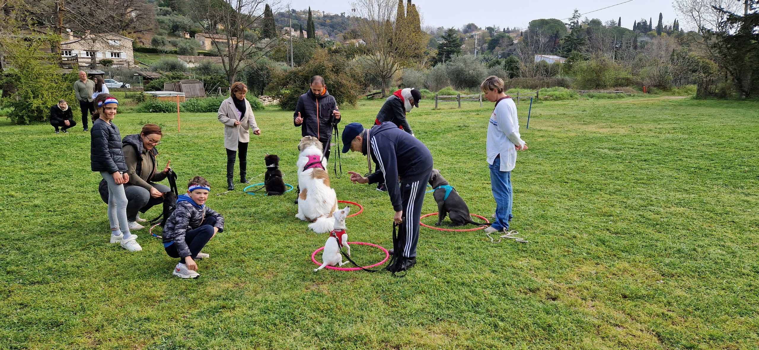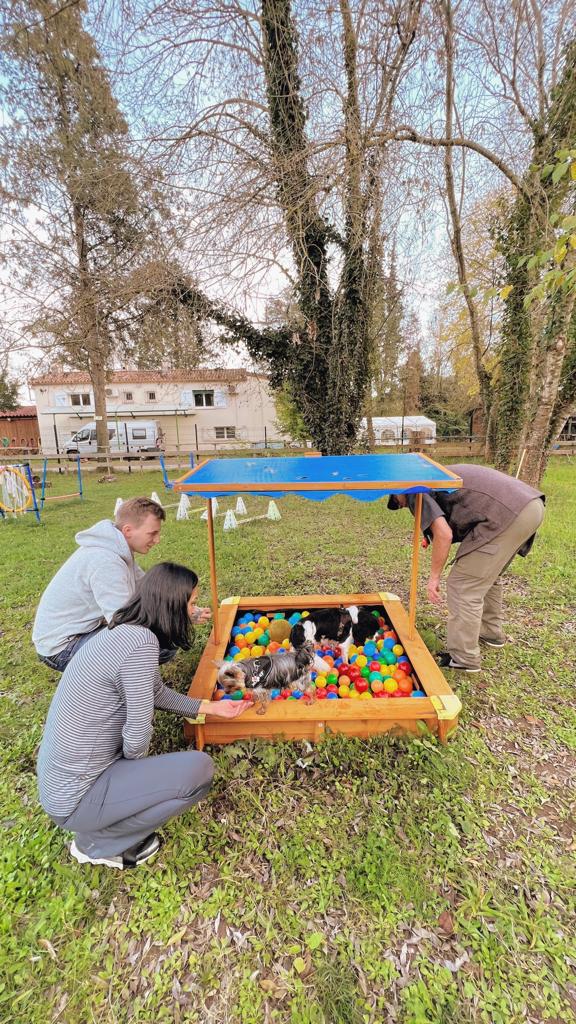 L’apprentissage se fait par jeux intelligents et éducatifs. Durant les séances collectives d’éducation il y a des moments de récréation pendant lesquels les chiens se socialisent en courant, en se poursuivant et en jouant ensemble.